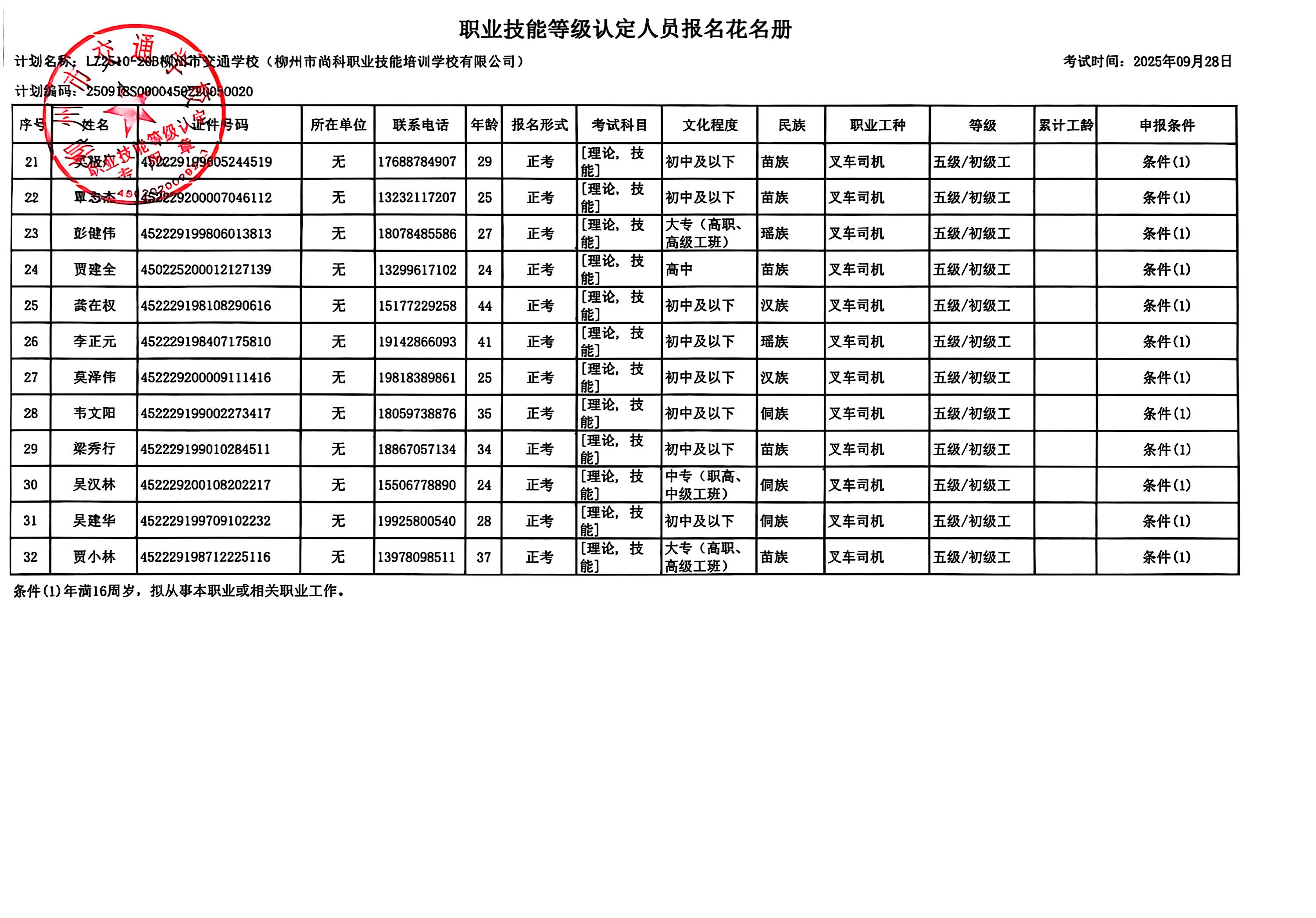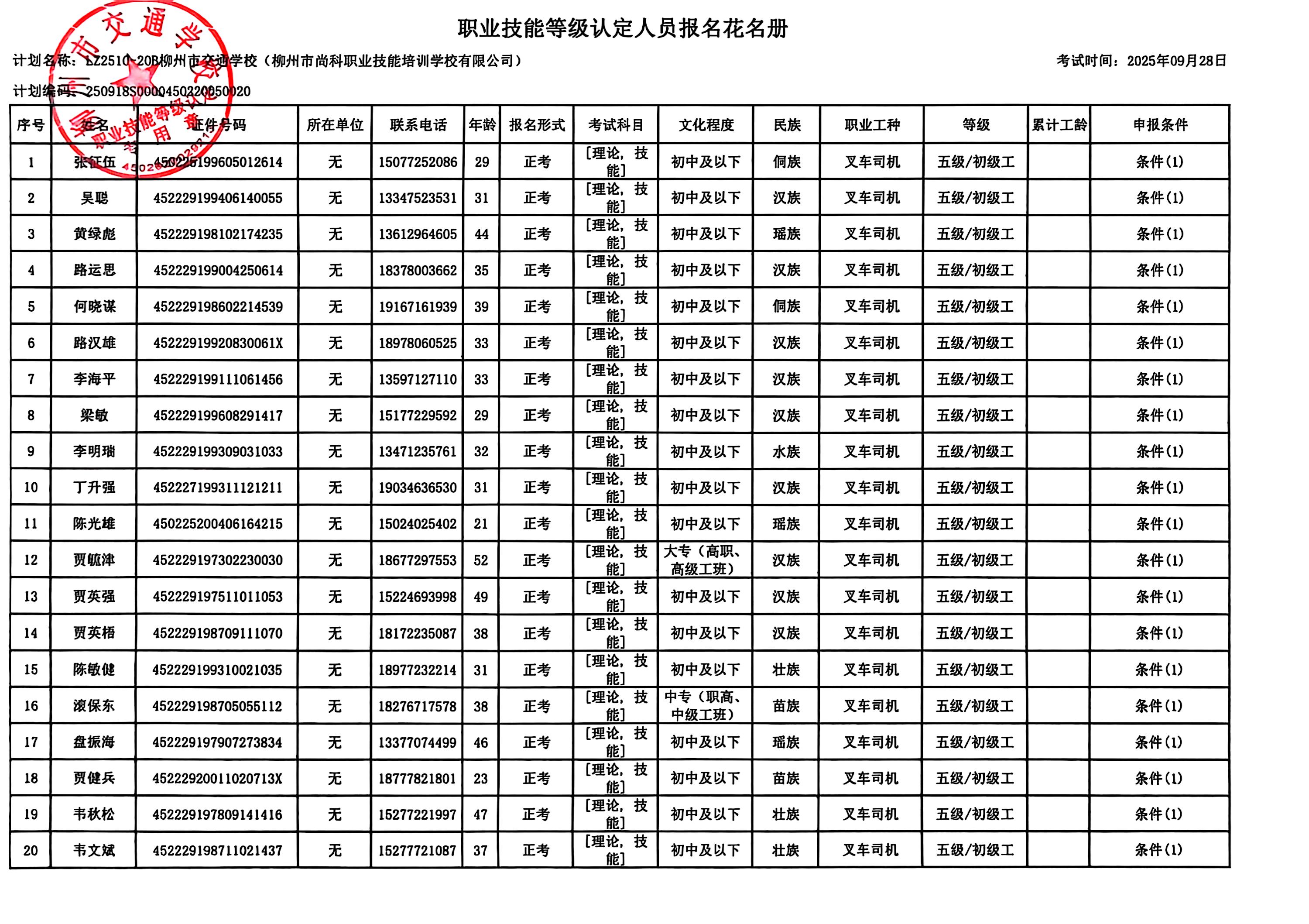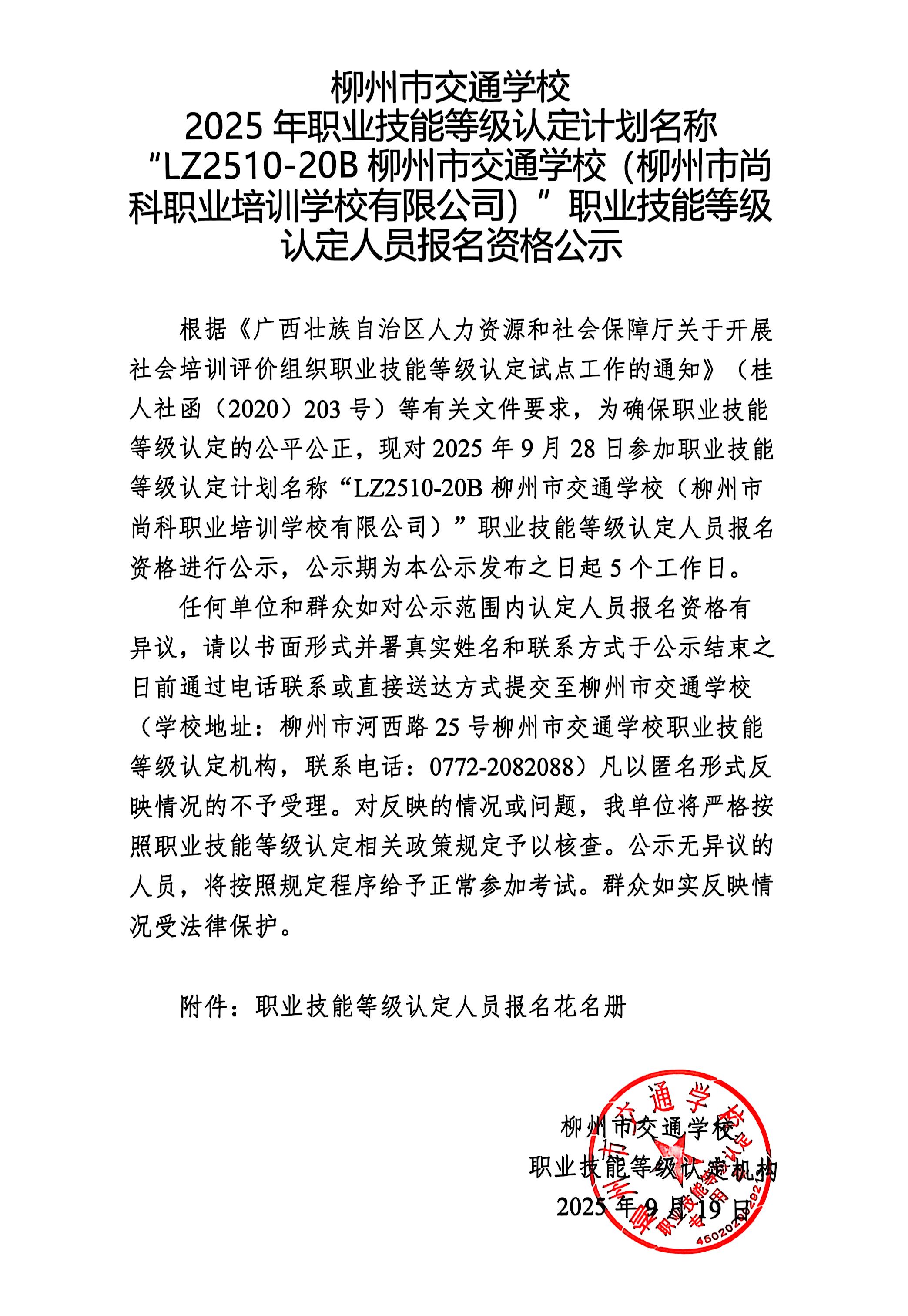 柳州巿交通学校2025年职业技能等级认定计划名称“LZ2510-20B菠菜信誉平台集合网(柳州市尚科职业培训学校有限公司)”职业技能等级认定人员报名资格公示