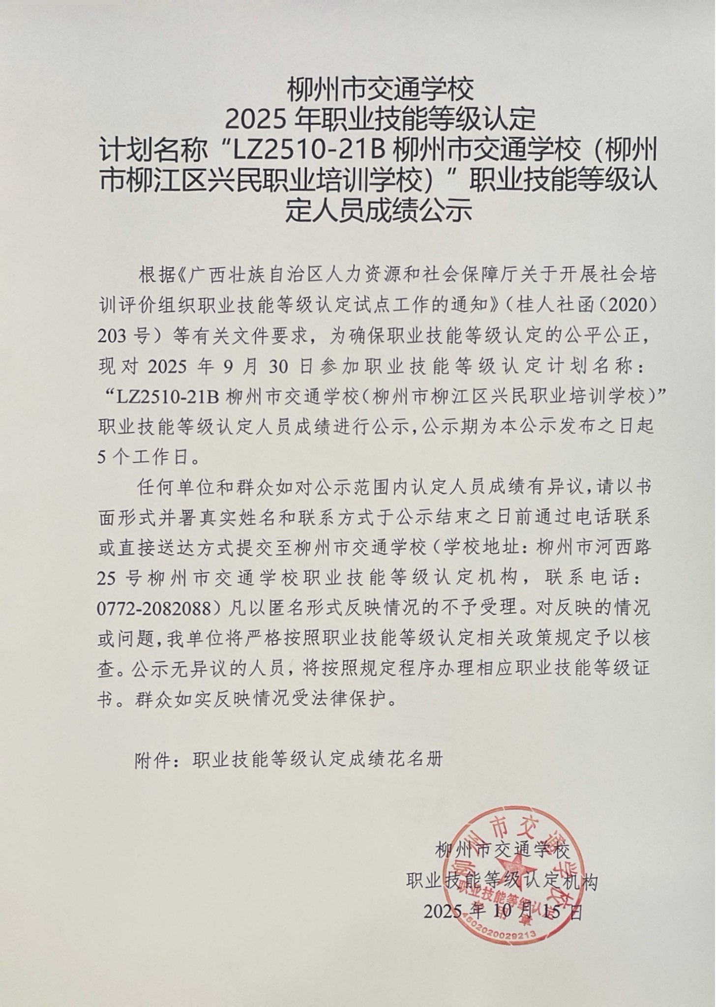 计划名称“LZ2510-21B菠菜信誉平台集合网(柳州市柳江区兴民职业培训学校)”职业技能等级认定人员成绩公示