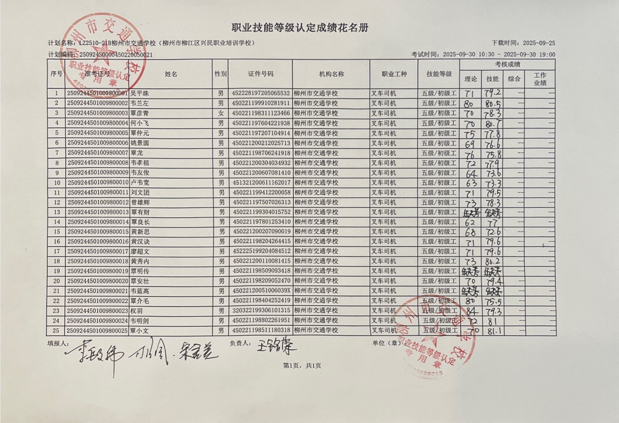 菠菜信誉平台集合网 2025年职业技能等级认定 计划名称“LZ2510-21B菠菜信誉平台集合网(柳州市柳江区兴民职业培训学校)”职业技能等级认定人员成绩公示