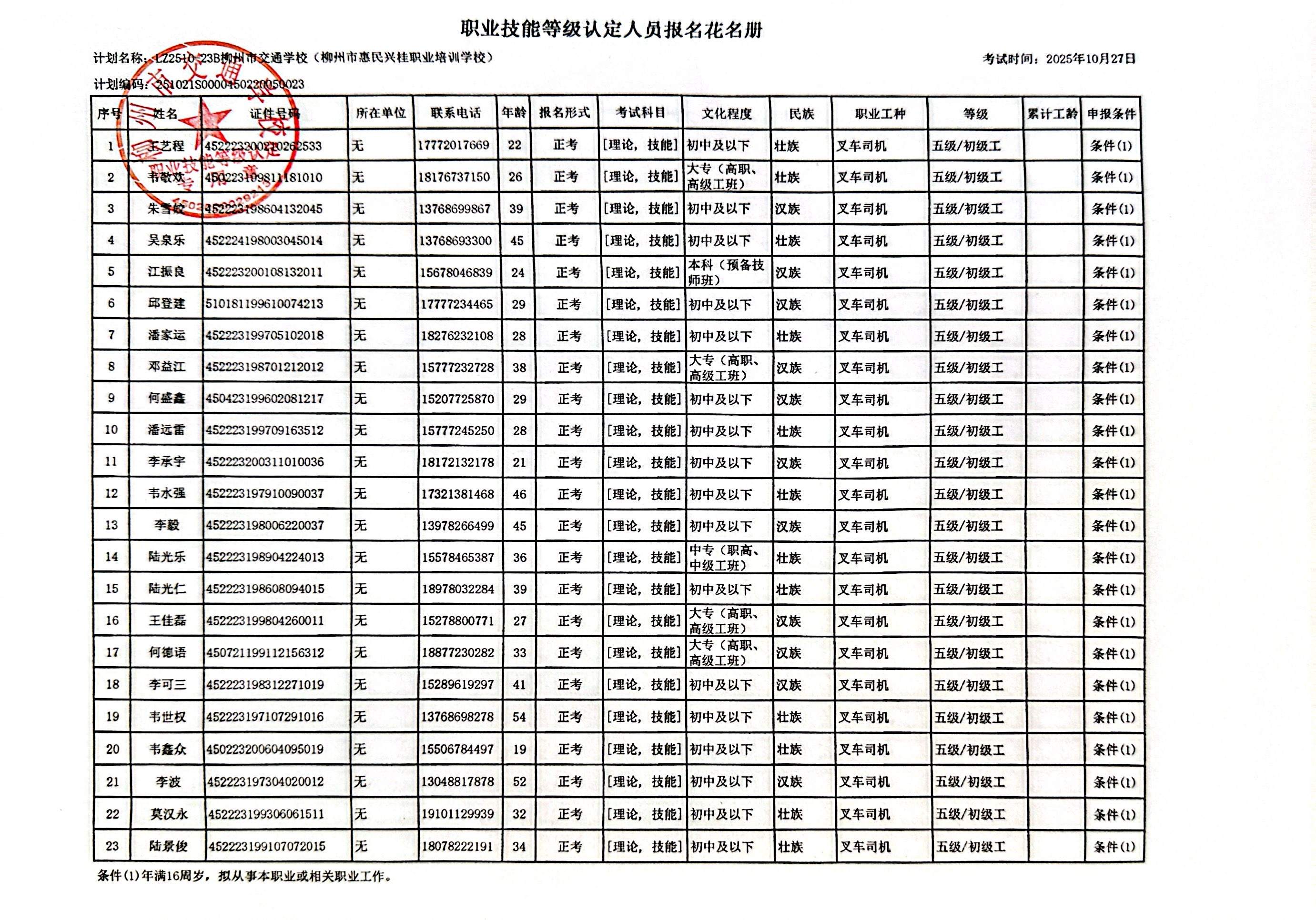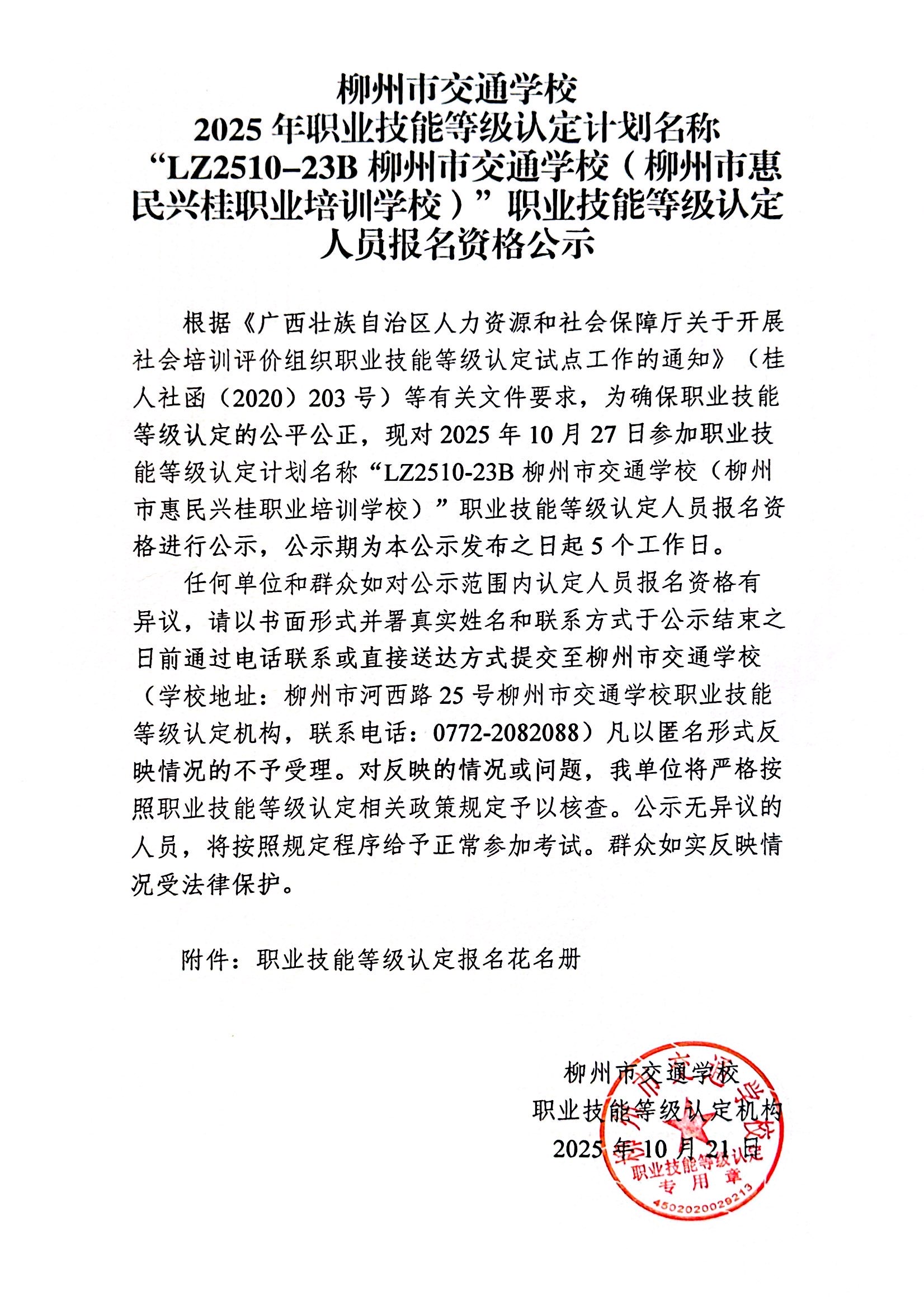 柳州巿交通学校2025年职业技能等级认定计划名称“LZ2510-23B菠菜信誉平台集合网(柳州市惠民兴桂职业培训学校)”职业技能等级认定人员报名资格公示