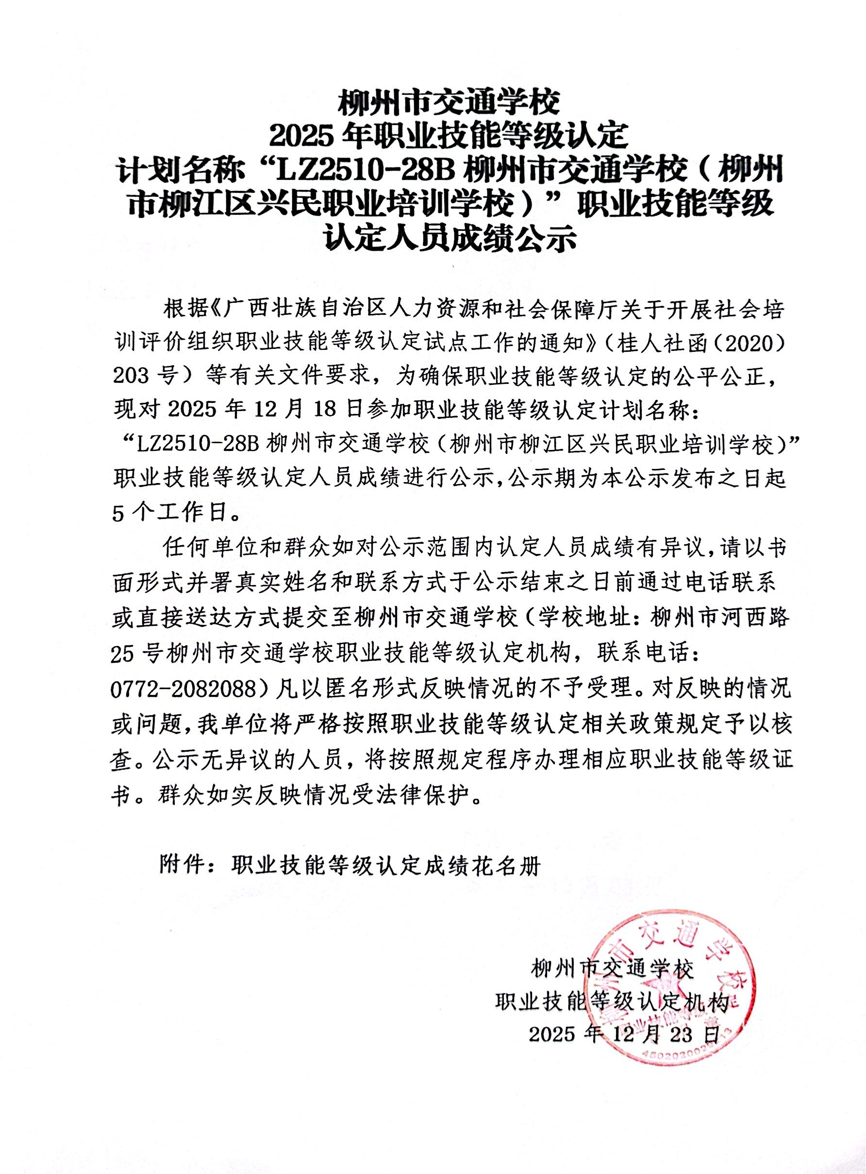 菠菜信誉平台集合网2025年职业技能等级认定计划名称“LZ2510-28B菠菜信誉平台集合网(柳州市柳江区兴民职业培训学校)”职业技能等级认定人员成绩公示