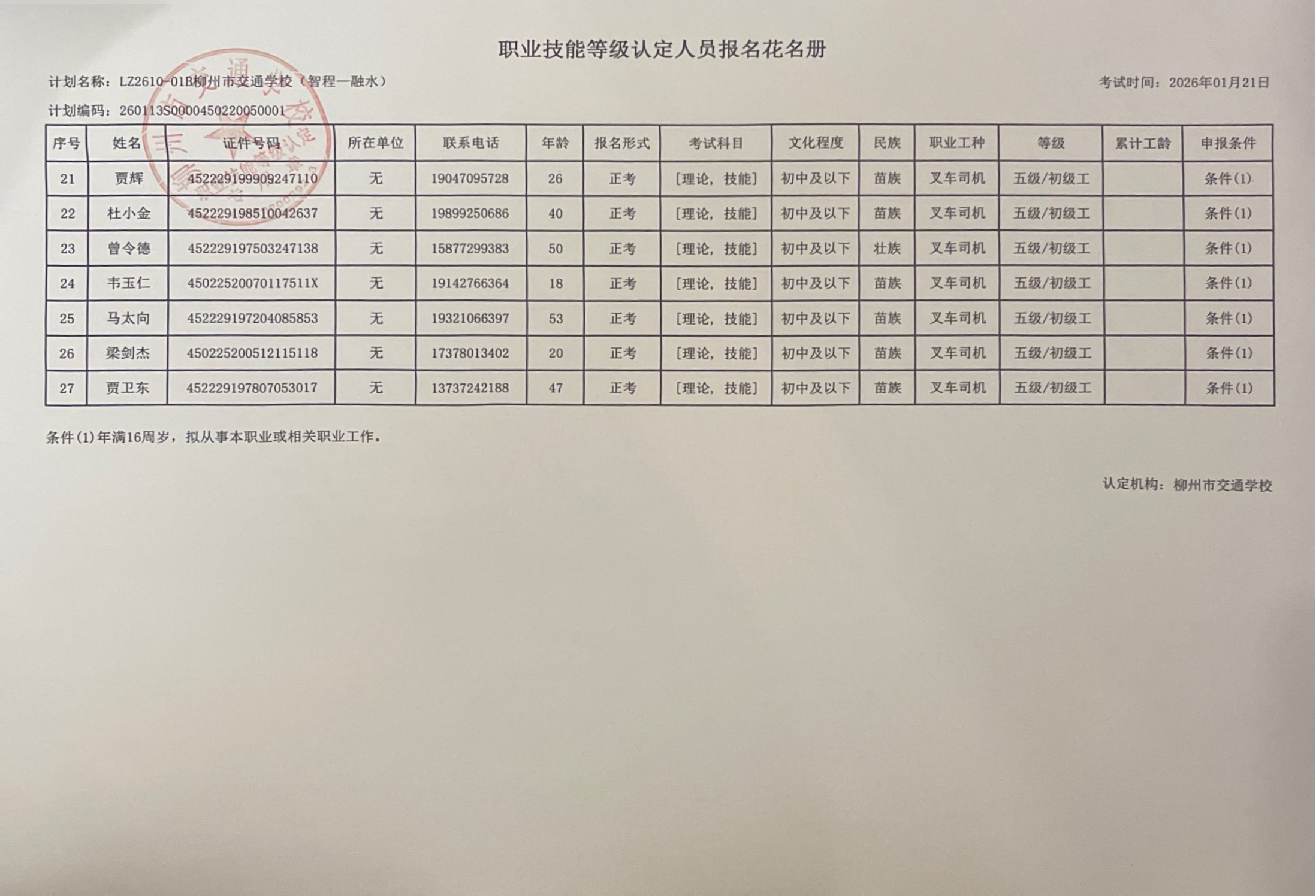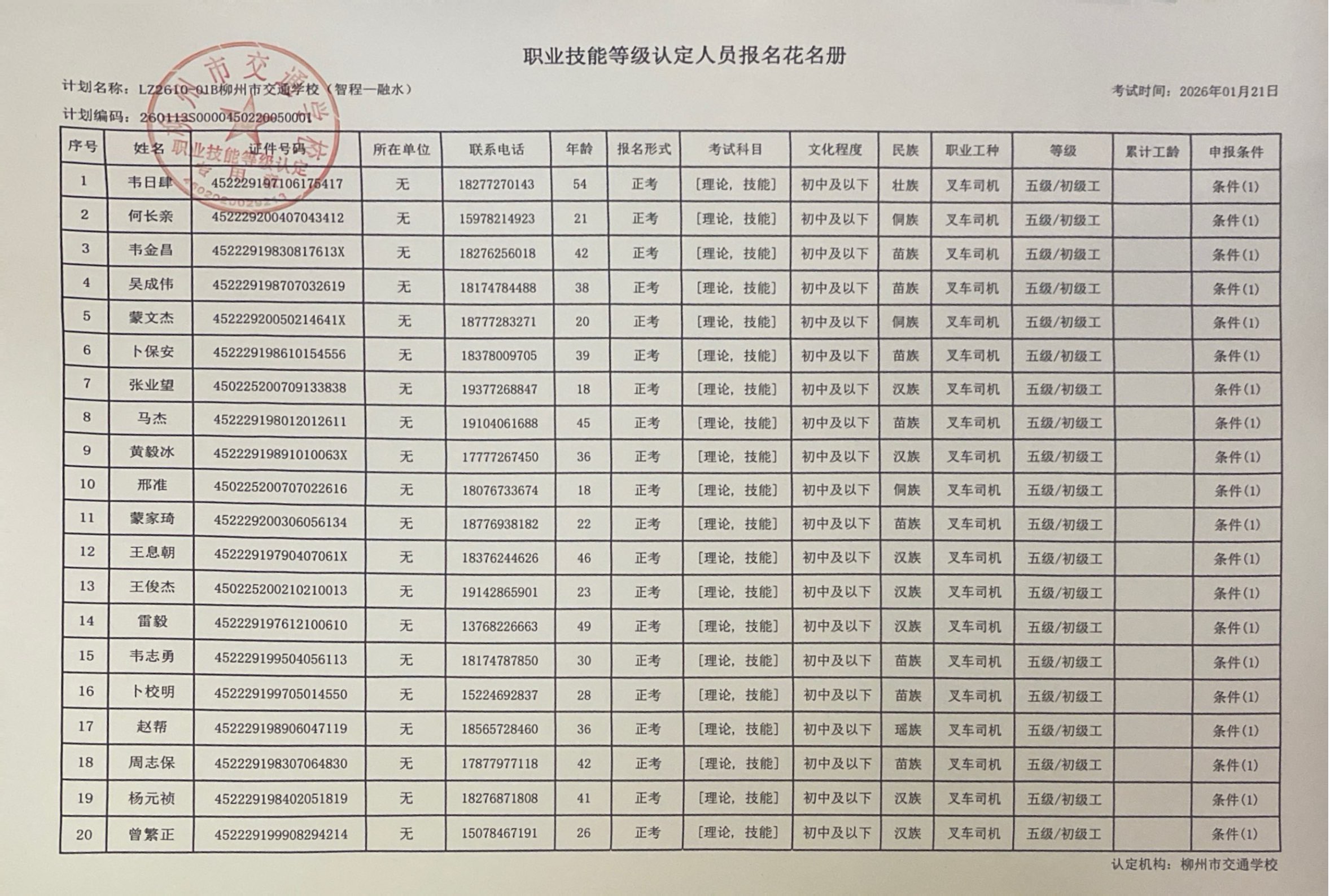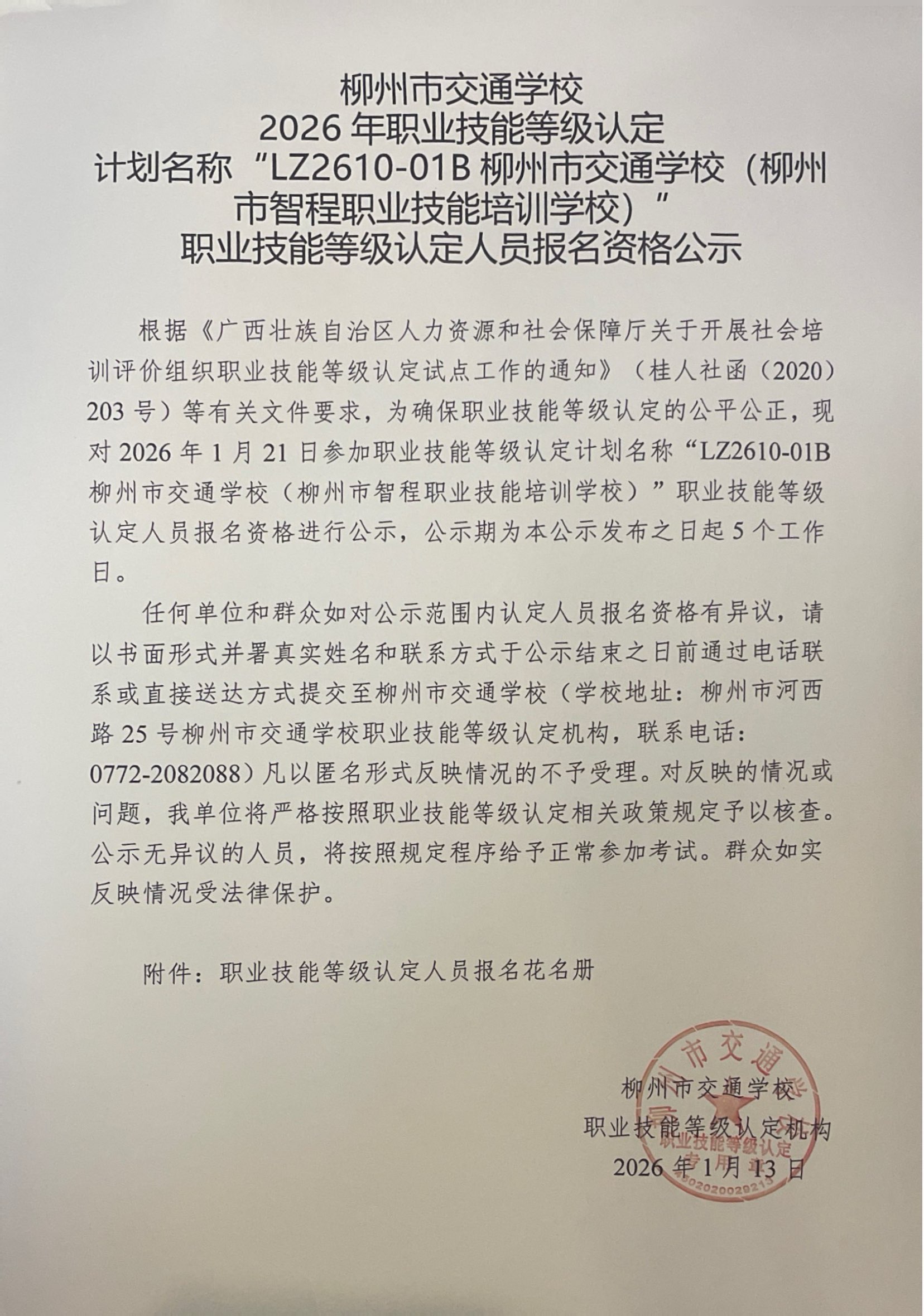 柳州巿交通学校2026年职业技能等级认定计划名称“LZ2610-01B菠菜信誉平台集合网(柳州市智程职业技能培训学校)”职业技能等级认定人员报名资格公示