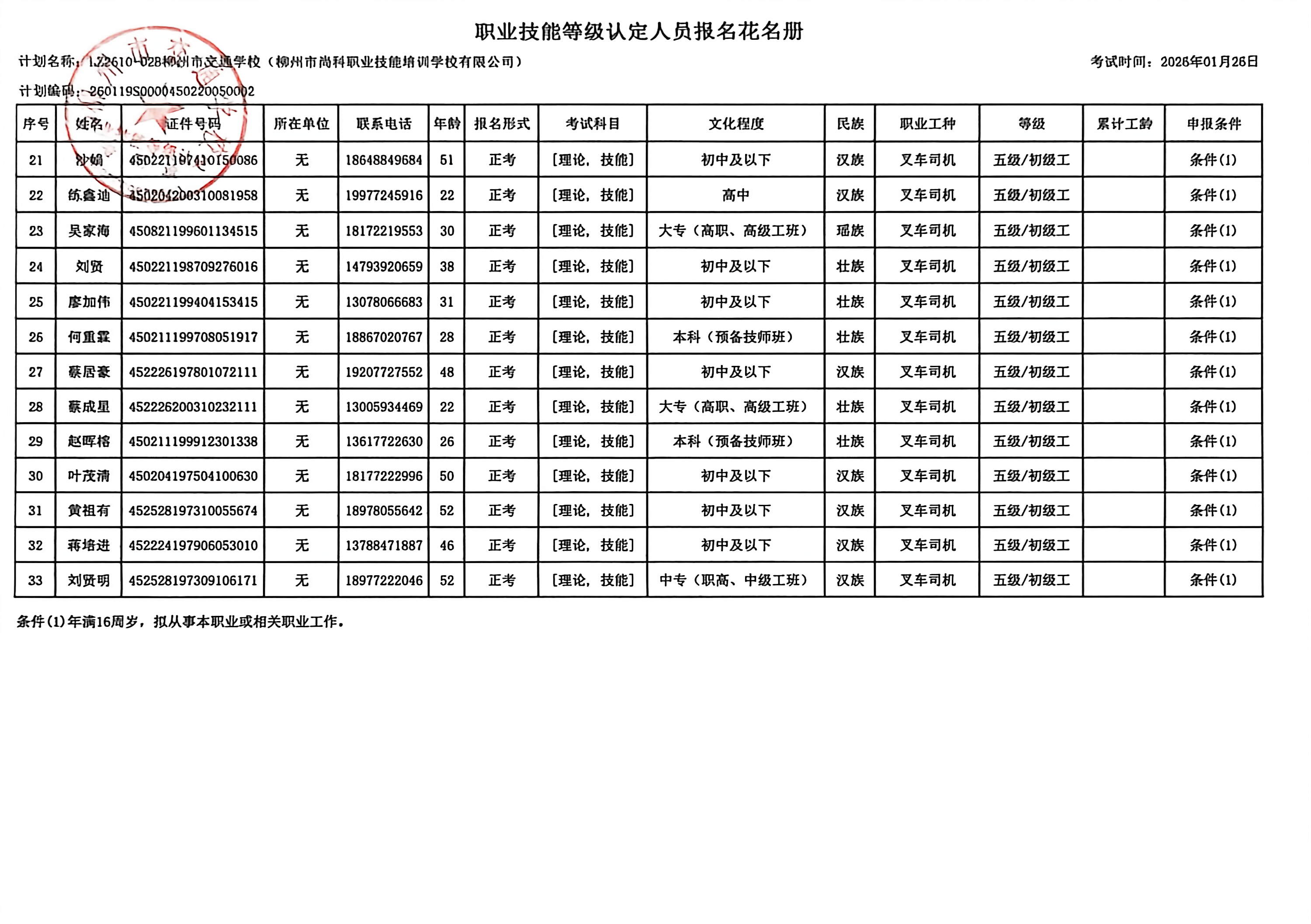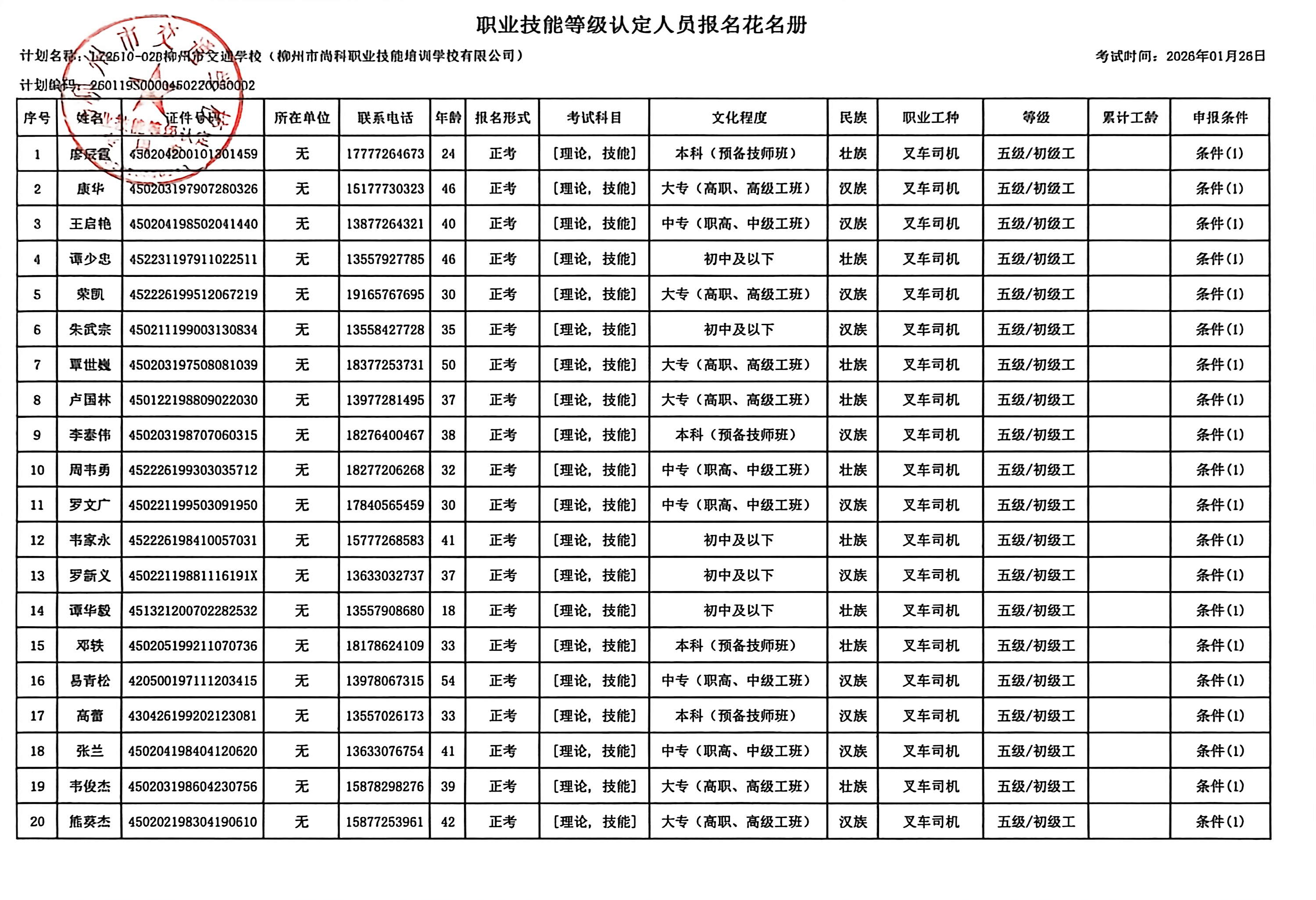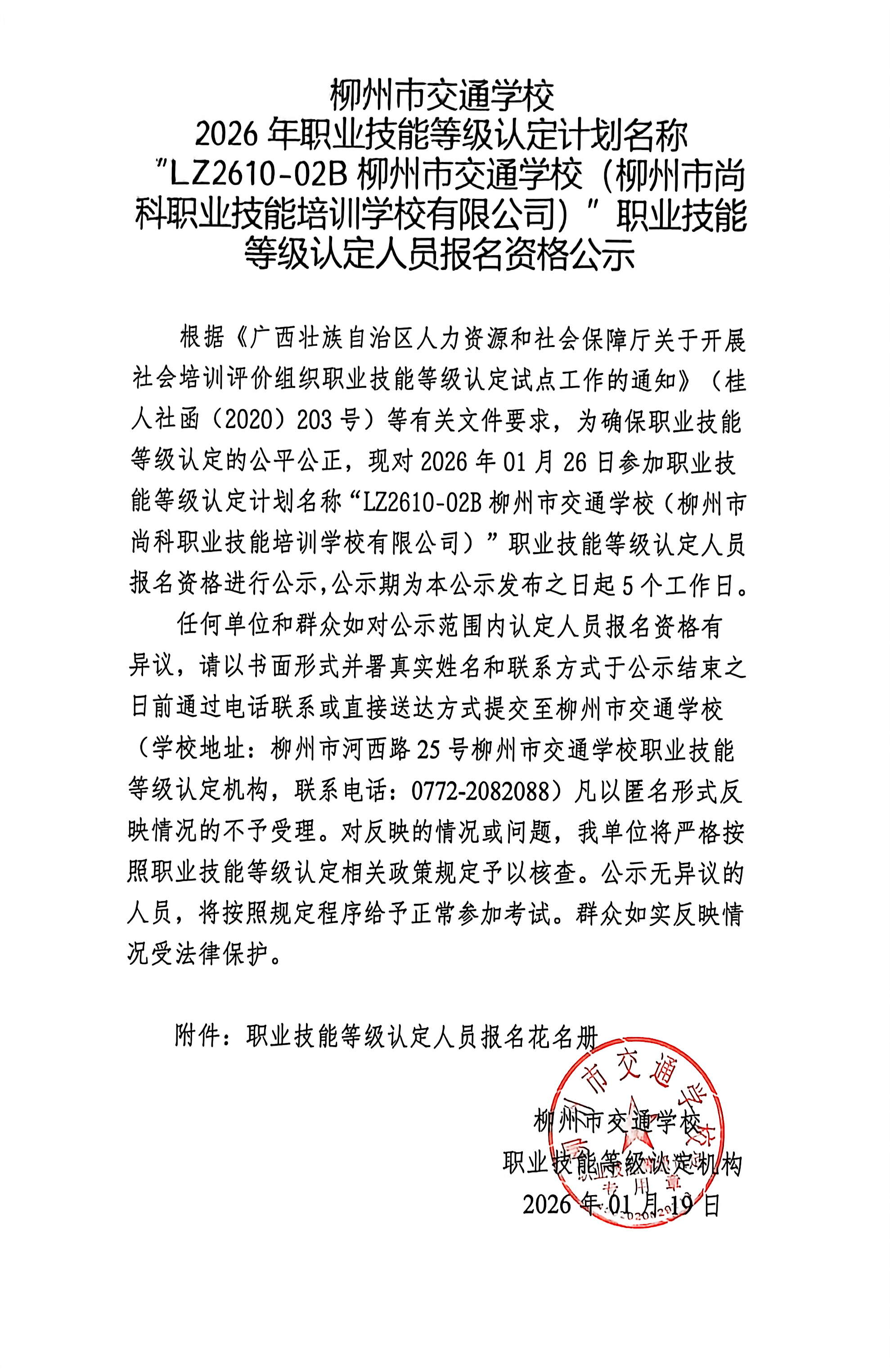 柳州巿交通学校2026年职业技能等级认定计划名称“LZ2610-02B菠菜信誉平台集合网(柳州市尚科职业技能培训学校有限公司)”职业技能等级认定人员报名资格公示