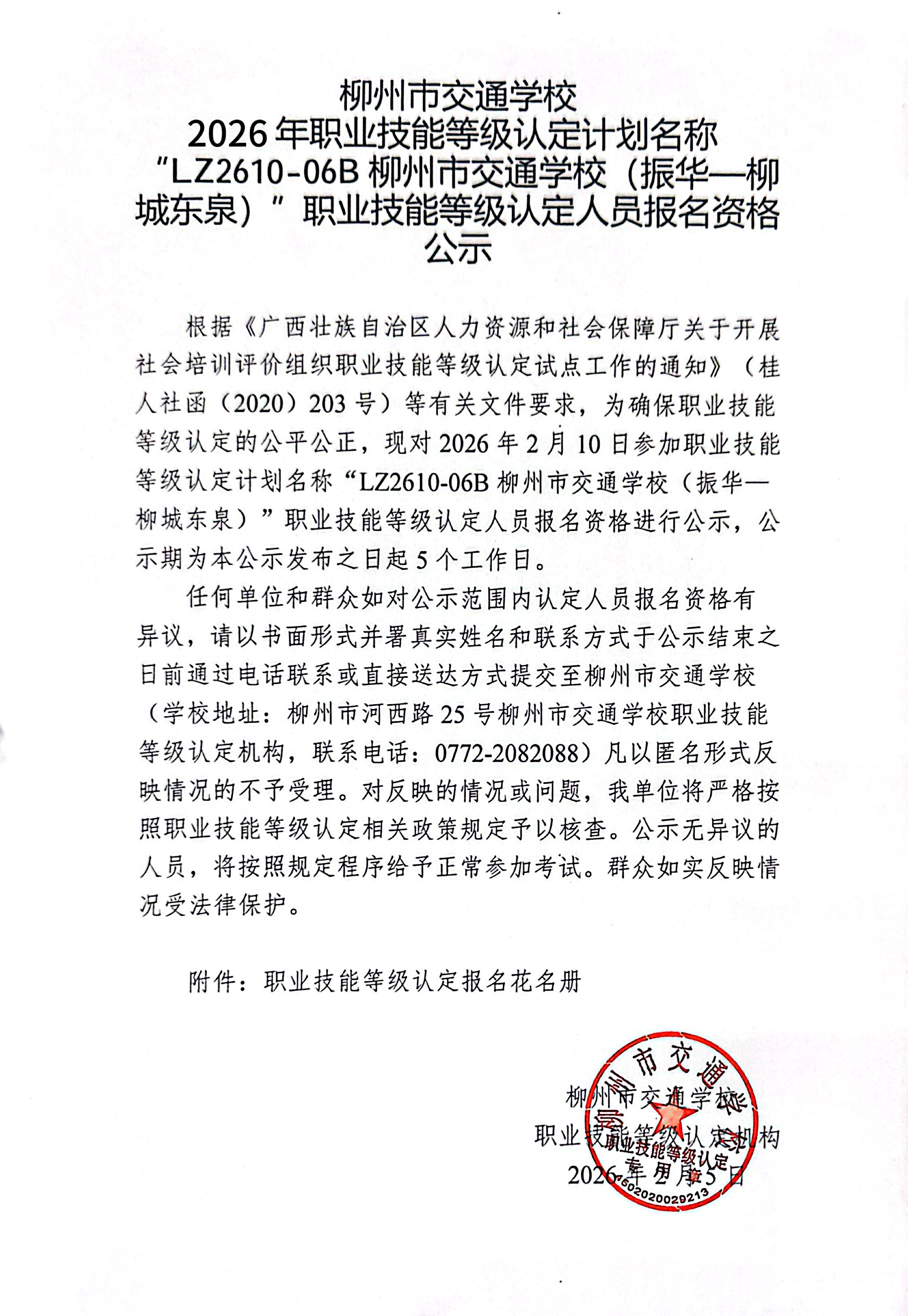 柳州巿交通学校2026年职业技能等级认定计划名称“LZ2610-06B菠菜信誉平台集合网(振华——柳城东泉)”职业技能等级认定人员报名资格公示