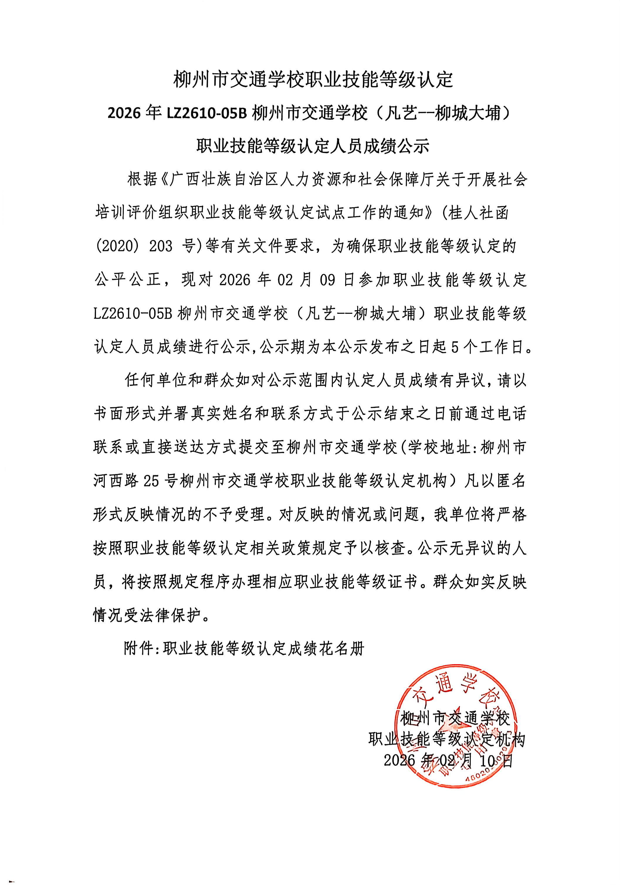 菠菜信誉平台集合网职业技能等级认定2026年LZ2610-05B菠菜信誉平台集合网(凡艺--柳城大埔)职业技能等级认定人员成绩公示