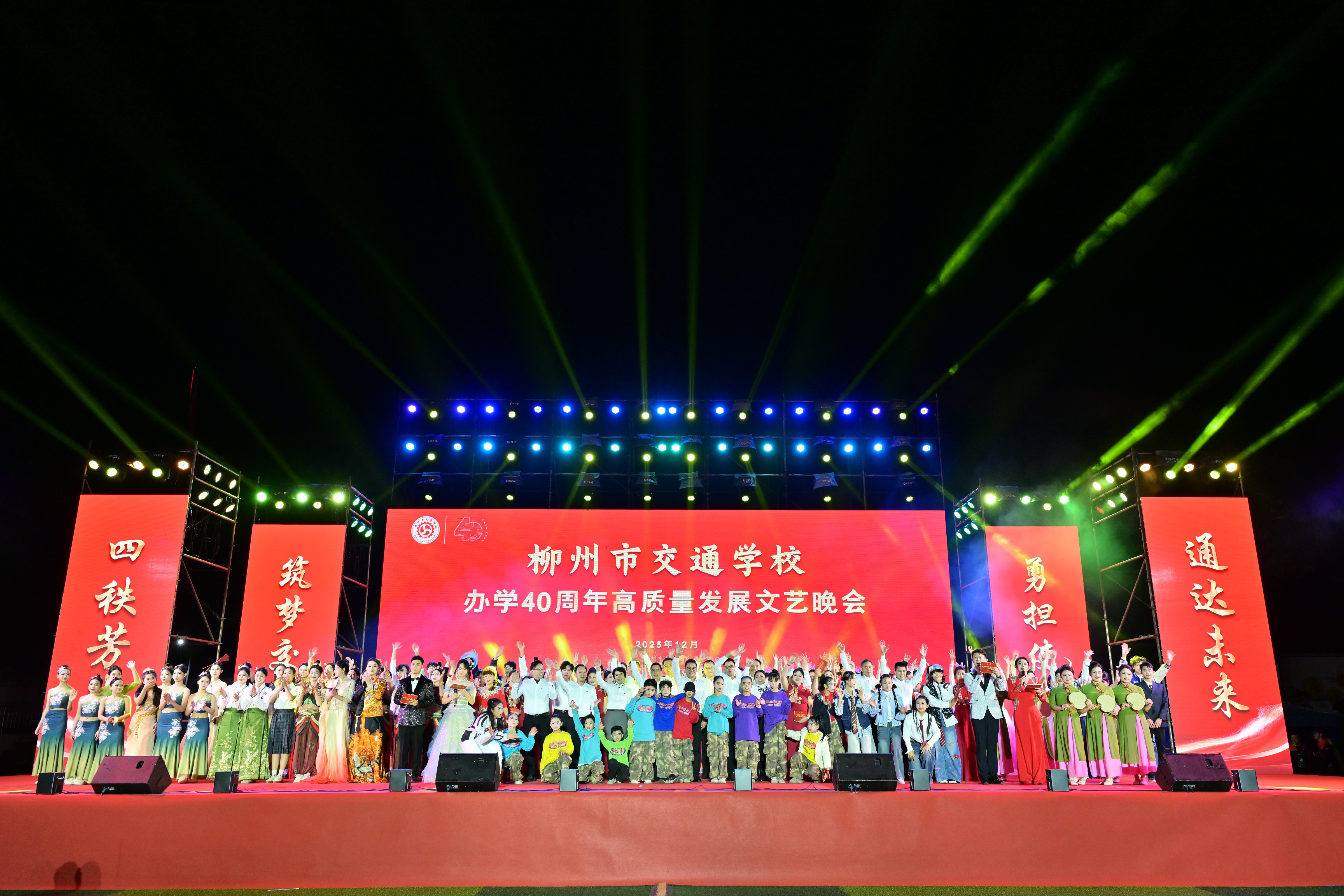 当晚,学校举办了“四秩芳华筑梦交通 勇担使命通达未来”文艺晚会暨迎新晚会,为办学40周年高质量发展大会画上了圆满的句号。晚会现场灯光璀璨,气氛热烈,歌舞、情景剧、朗诵等节目精彩纷呈,演员们用饱满的热情和精湛的技艺,展现了交校人的风采与活力。晚会过程中,还穿插了互动环节,现场观众积极参与,气氛热烈非凡。整场晚会不仅是一场视听盛宴,更是一次情感的凝聚,让每一位交校人都感受到了学校的温暖与力量,共同为学校四十华诞喝彩。