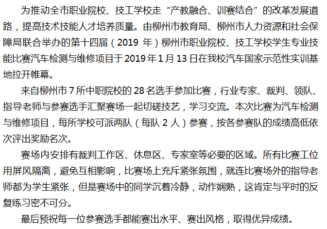 第十四届(2019 年)柳州市职业院校、技工学校 学生专业技能比赛(汽车检测与维修项目)在我校顺利举行