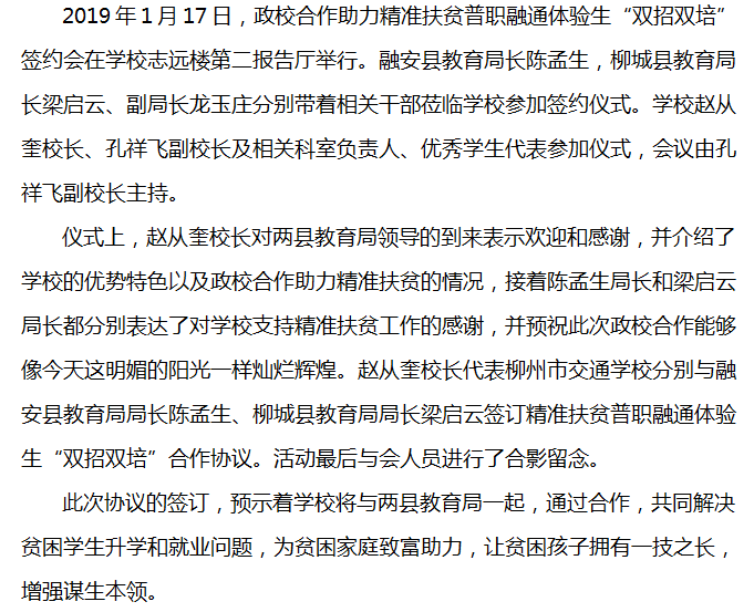 政校合作精准扶贫,双招双培共育人才 ——政校合作助力精准扶贫普职融通体验生“双招双培”签约会