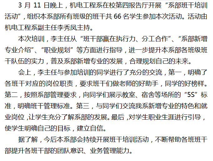 强化班干队伍,共建和谐班级 ——机电工程系开展系部班干培训活动