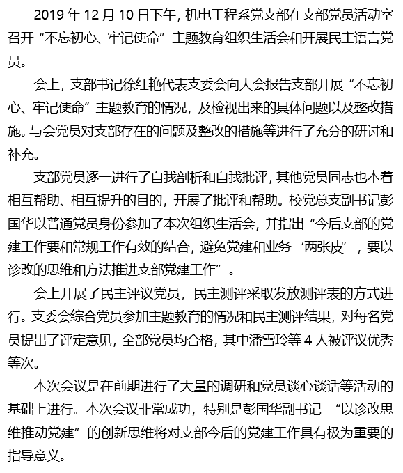 菠菜信誉平台集合网机电工程系党支部召开“不忘初心、牢记使命” 主题教育专题组织生活会