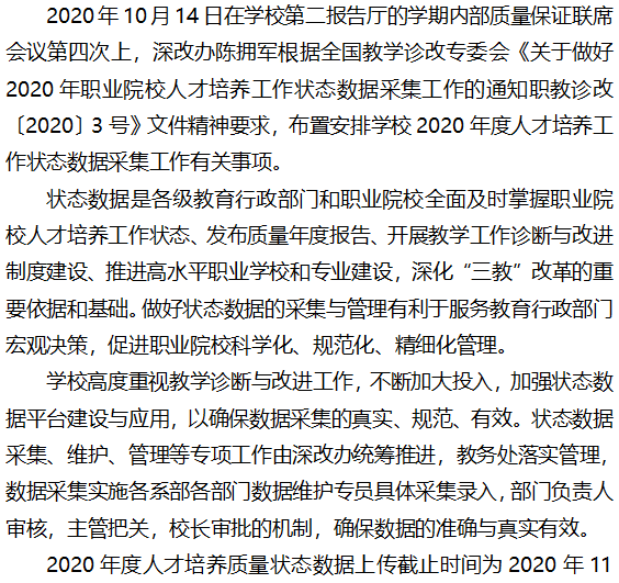 持之以恒推进质量过程管控 孜孜以求强化数据真实采集 ——学校深改办统筹推进教学诊改信息化平台人才培养质量数据采集工作