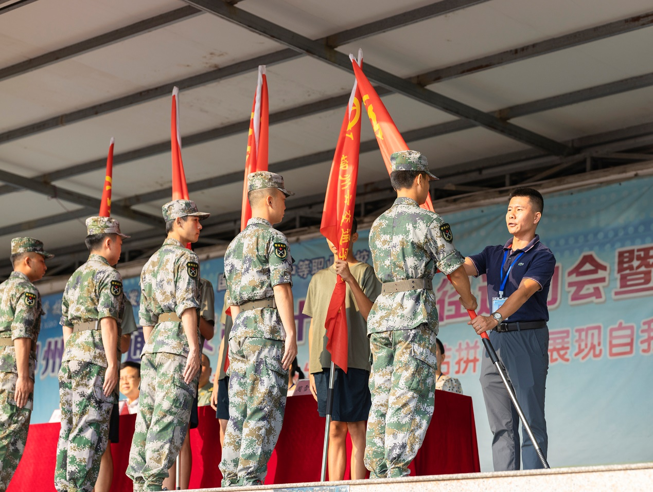 接着,各系部主任为各连队授旗。教官们依次庄严地接过一面面旗帜。红色的旗帜随风飘扬,军魂已然在其中萌发。授旗仪式为军训的正式开始营造了热烈而庄严的氛围。
