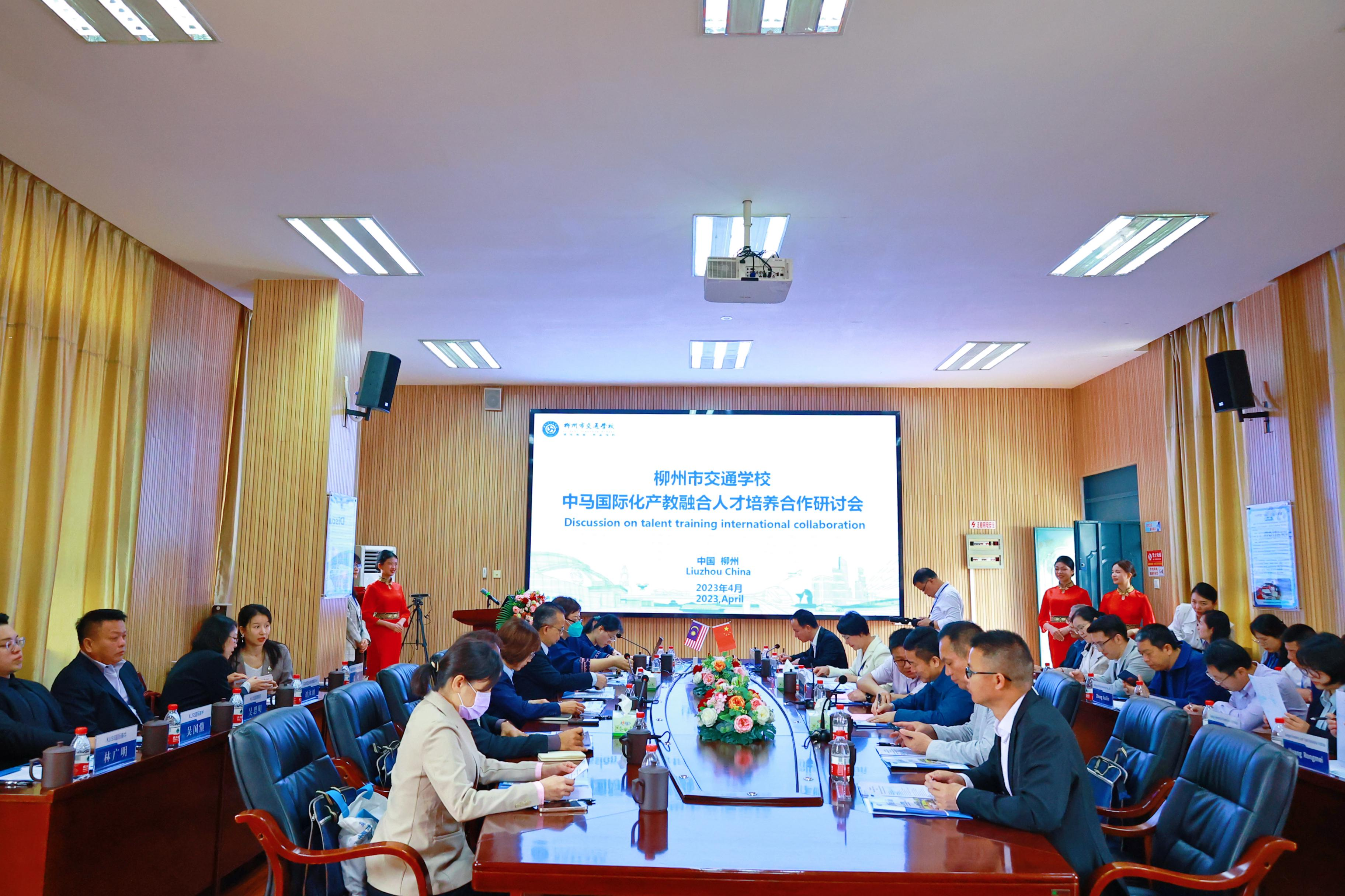 为贯彻落实《关于深化现代职业教育体系建设改革的若干措施》,根据《教育部广西壮族自治区人民政府共同推进广西教育高质量发展战略合作协议》,大力发展适应新技术和产业变革需要的职业教育,打造面向东盟职业教育开放合作创新高地,学校积极落实行动计划中“柳州职业教育国际合作模式创新行动”,加强合国际化交流与合作,创新人才培养模式,提高人才培养质量。4月12日上午,以“校企共商国际化人才培养,精准服务东盟职业教育”为主题的中马国际化产教融合人才培养合作研讨会在我校举行。本次研讨会上,政、校、企多方汇聚一堂,马来西亚全球教育服务中心、马来西亚汽车工业大学(线上)、马来西亚马六甲技术大学(线上)、马来西亚国家能源大学、马来西亚沙巴大学、KLISS国际高中、市教育局、市外事办、上汽通用五菱汽车股份有限公司、东风柳州汽车有限公司、广西汽车集团有限公司、广西科技大学、广西经贸职业技术学院、市交通学校相关合作单位代表、市交通学校校长黄䶮和相关负责人出席研讨会。