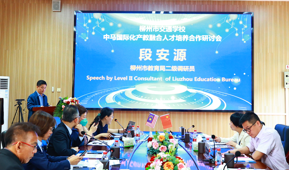 会上,校长黄䶮介绍学校产教融合基本情况与学校根据“立足大交通,筑梦海陆空”发展目标,秉承“德技并举,志善相彰”校训精神,构建了集水路、陆路、铁路、航空为一体的“大交通”专业格局“特色立校”之路。马来西亚国际教育服务中心(EMGS)市场与宣传部总监刘雯美女士致辞,希望加速学校与马来西亚合作与交流。市教育局二级调研员段安源也表示,此次国际化产教融合研讨会的召开,代表了交通学校依靠自己专业特色走出国门、走向国际。市教育局高度支持市交通学校与马来西亚各大院校开展国际交流与合作,希望通过合作,在人才培养、教学资源共建共享、技术技能培训、海外实习实训、师资国际化培训上探索中马两国职业教育全面合作的“柳州模式”,为促进中马两国职业教育的合作与交流做出积极贡献。