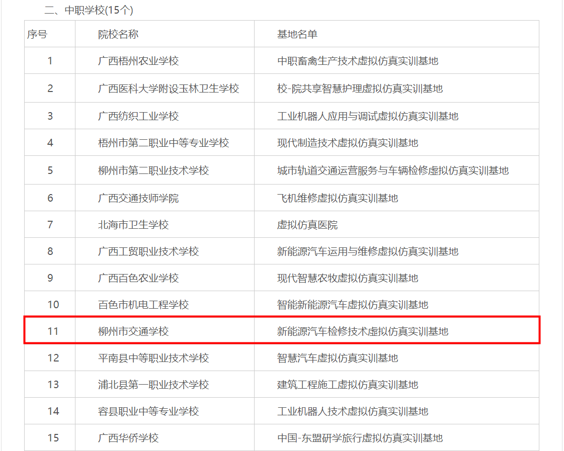 近日,广西壮族自治区教育厅公布了自治区教育厅第三批职业教育示范性虚拟仿真实训基地建设项目,我校新能源汽车运用与维修专业成功获批建设“新能源汽车检修技术虛拟仿真实训基地”。