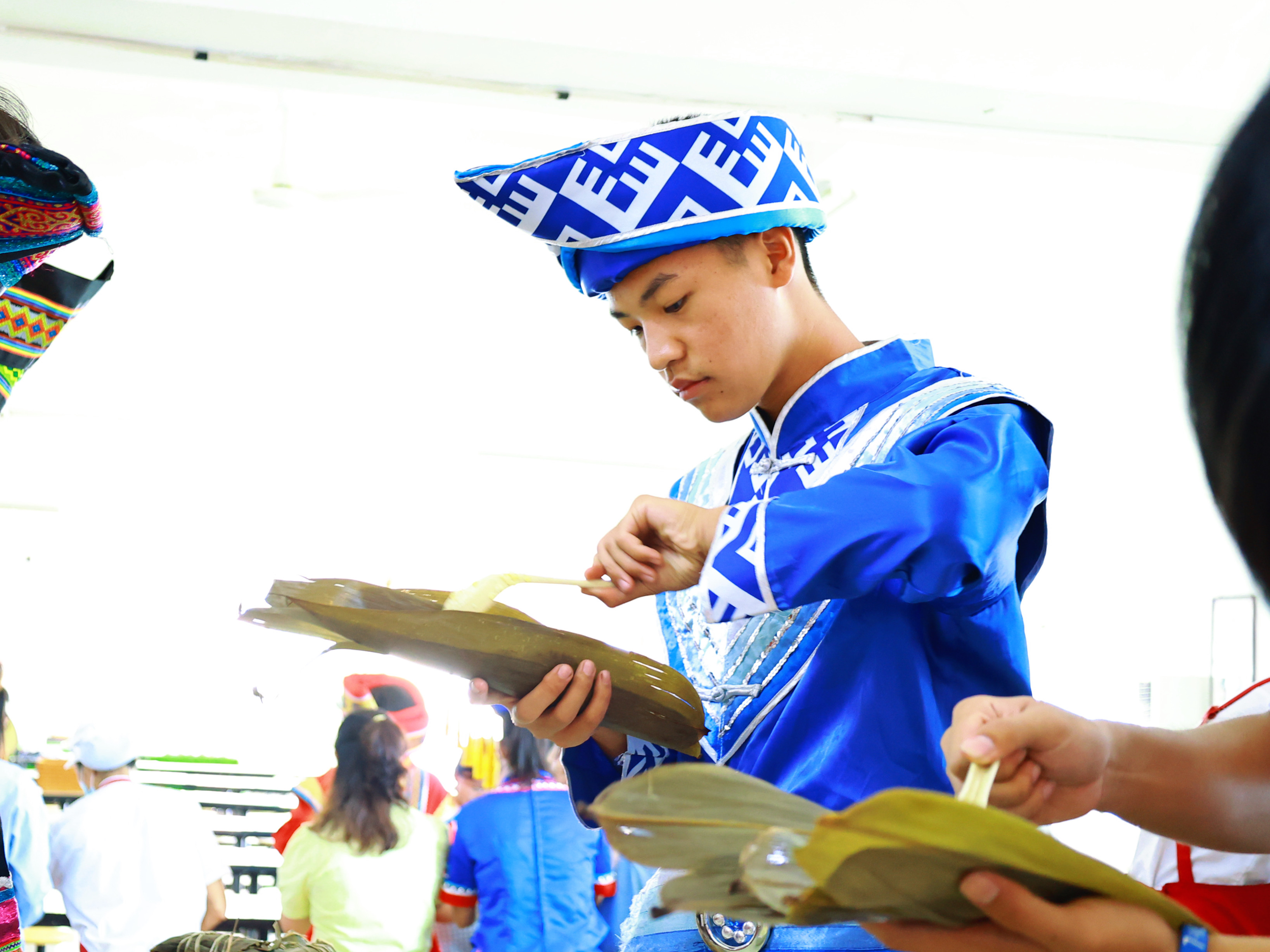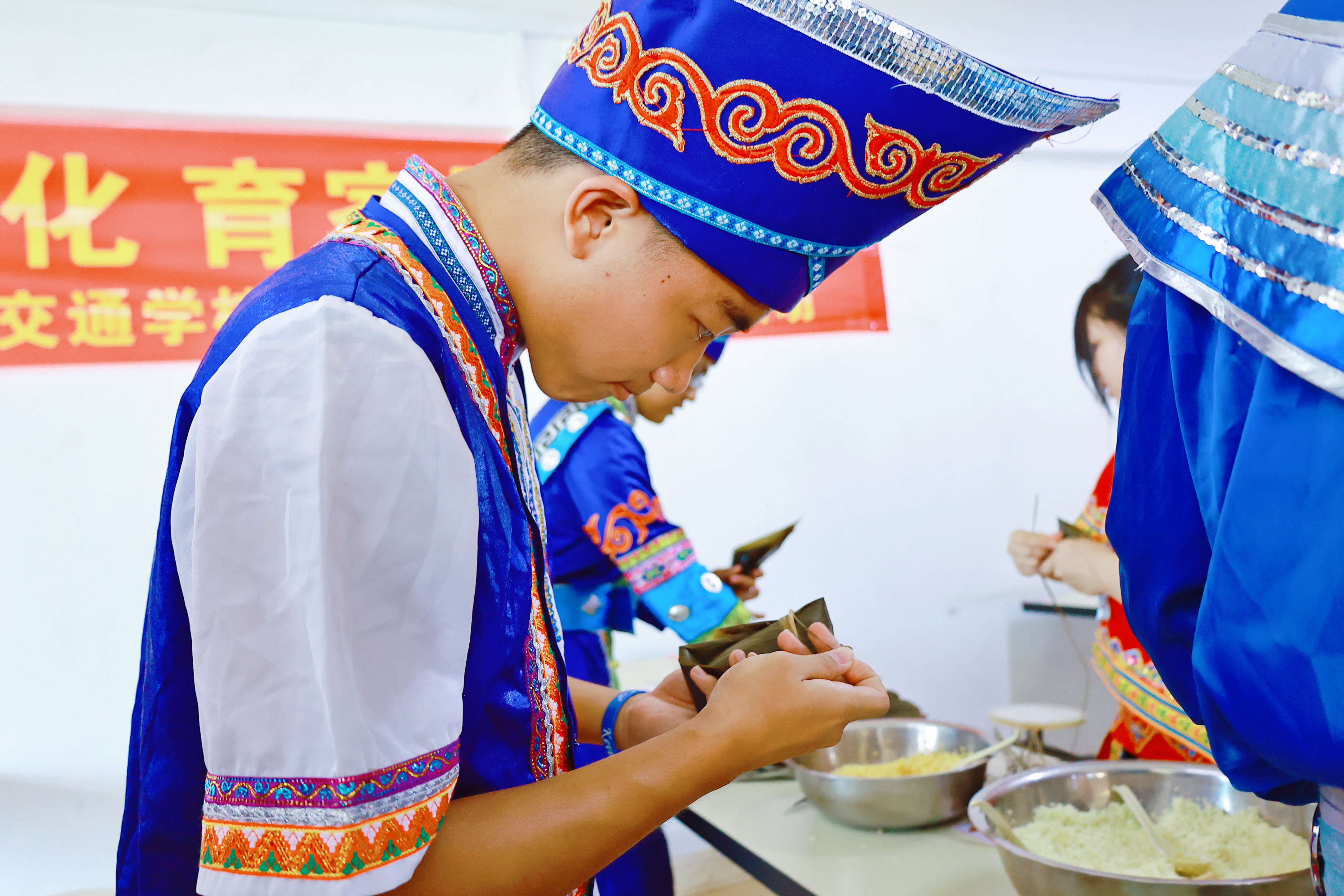 “年轻的时候每逢端午都会包很多粽子,现在很少包了,过节就没氛围,听说我们学校有包粽子活动,我立马报名参加了,来感受大家庭浓浓的节日气氛……”某位老教师兴奋的说到。活动现场,穿着各式各样民族服饰的学生与老师们纷纷拿起粽叶,折粽叶、放馅料、裹叶子、扎线……一道道工序有条不紊。整个过程一气呵成,不一会儿就包出了满满一盘漂亮、饱满的粽子。师生们一边包粽子,一边唠家常,整个活动弥漫着粽叶的清香,洋溢着节日的喜悦。21船舶3班雷烨兴奋的说:“好开心呀,我也学会包粽子了,回家我要给我爸妈露一手……”