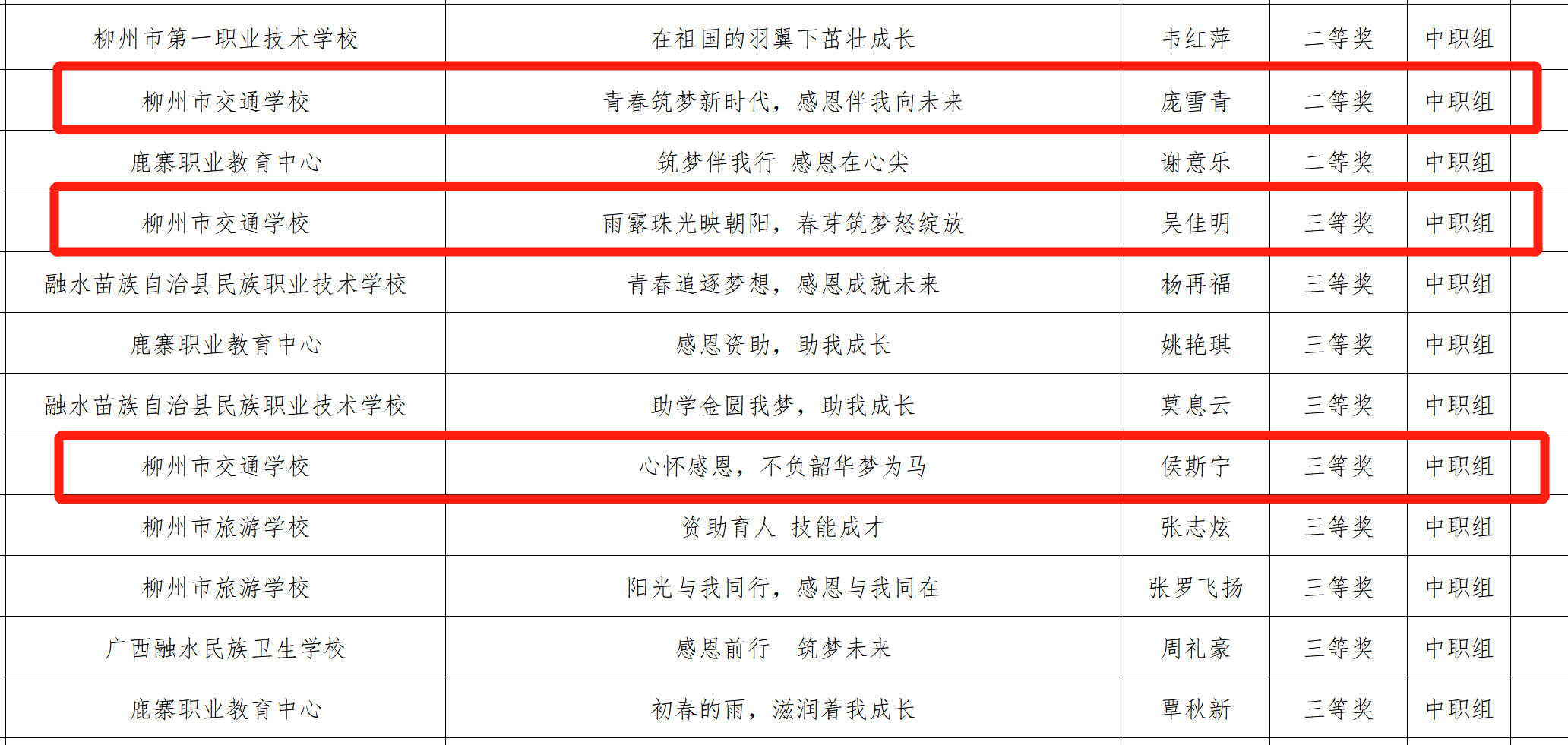 其中22路桥班庞雪青同学的《青春筑梦新时代,感恩伴我向未来》荣获二等奖,指导教师:吴丹、韦莉薇;20汽营班吴佳明同学的《雨露珠光映朝阳,春芽筑梦怒绽放》荣获三等奖,指导教师:何俊梅;22物流4班侯斯宁同学的《助学圆梦,传递爱意》荣获三等奖,指导教师:刘彦彦、韦莉薇。