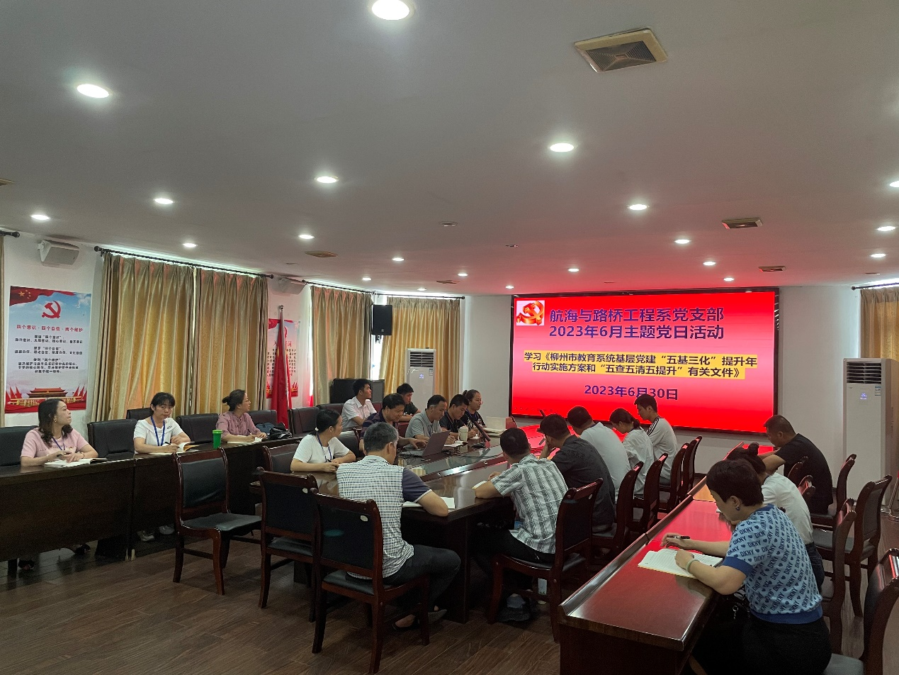 2023年6月30日,航海与路桥工程系系党支部在学校展望楼第一报告厅开展六月主题党日活动。活动由支部书记陈鼎主持,支部全体党员参加。此次活动,学习了《柳州市教育系统基层党建“五基三化”提升年行动实施方案和“五查五清五提升” 》有关文件、学习了杨宁、郑志明先进典型事迹,同时还邀请了罗柳健副校长为全体党员上主题党课。