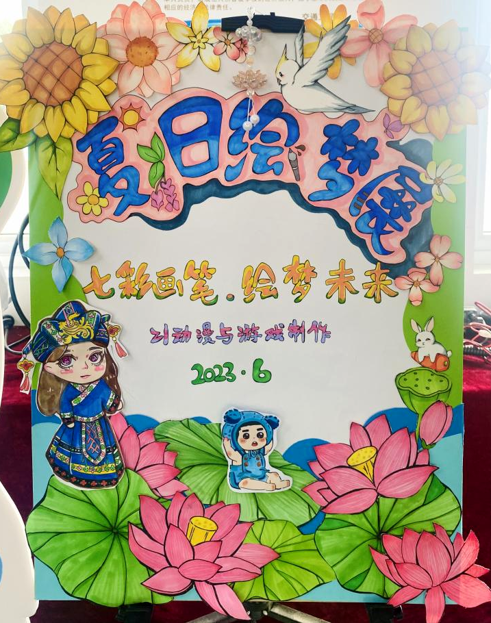 荷花盛开于夏日,体现清纯高洁、清廉公正的精神,希望同学们也能永葆清正廉洁之心,“出淤泥而不染,濯清涟而不妖”,手持七彩画笔绘出美好未来。同学们多样的绘画作品给学校师生带来了一场精彩的艺术盛宴,同时也充分展现了学校高质量发展的教学成果,展示了2021级动漫与游戏制作班的同学们在中职专业学习中的专业素养和技法表现,利用画笔在纸上尽情的描绘着情感和创意。