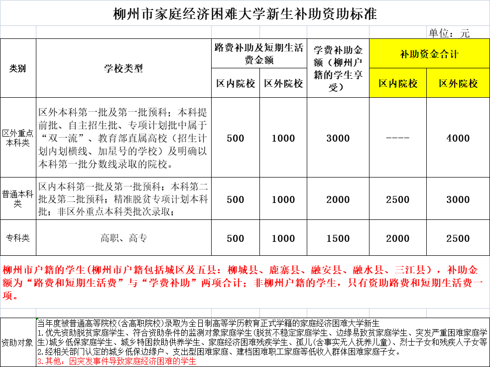 A同学属于柳州市的贫困生,今年考上广西的大专,即可获得路费补助及短期生活费金额500元,学费补助金额(仅柳州户籍的学生享受)1500元,共2000元人民币!