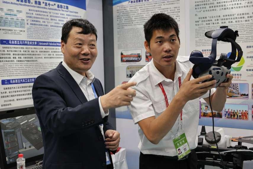 自治区教育厅职成处副处长廖造壮、主任郭进磊、职业技术教育学院院长 中国-东盟职业教育研究中心秘书长王屹等领导、兄弟院校嘉宾以及来自多个东盟国家的国际友人莅临菠菜信誉平台集合网展区,观看了学校展示的“ 船舶虚拟仿真设备”“动力电池均衡仪”“机甲大师与无人机展示”等项目。学校校长黄䶮、副校长罗柳健向领导、嘉宾们介绍了学校专业特色、发展前景、国际化办学情况。学校特色发展获得了参观者的赞赏与肯定。
