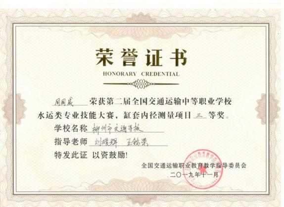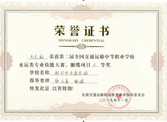 第二届全国交通运输中等职业学校水运类专业技能大赛荣誉证书