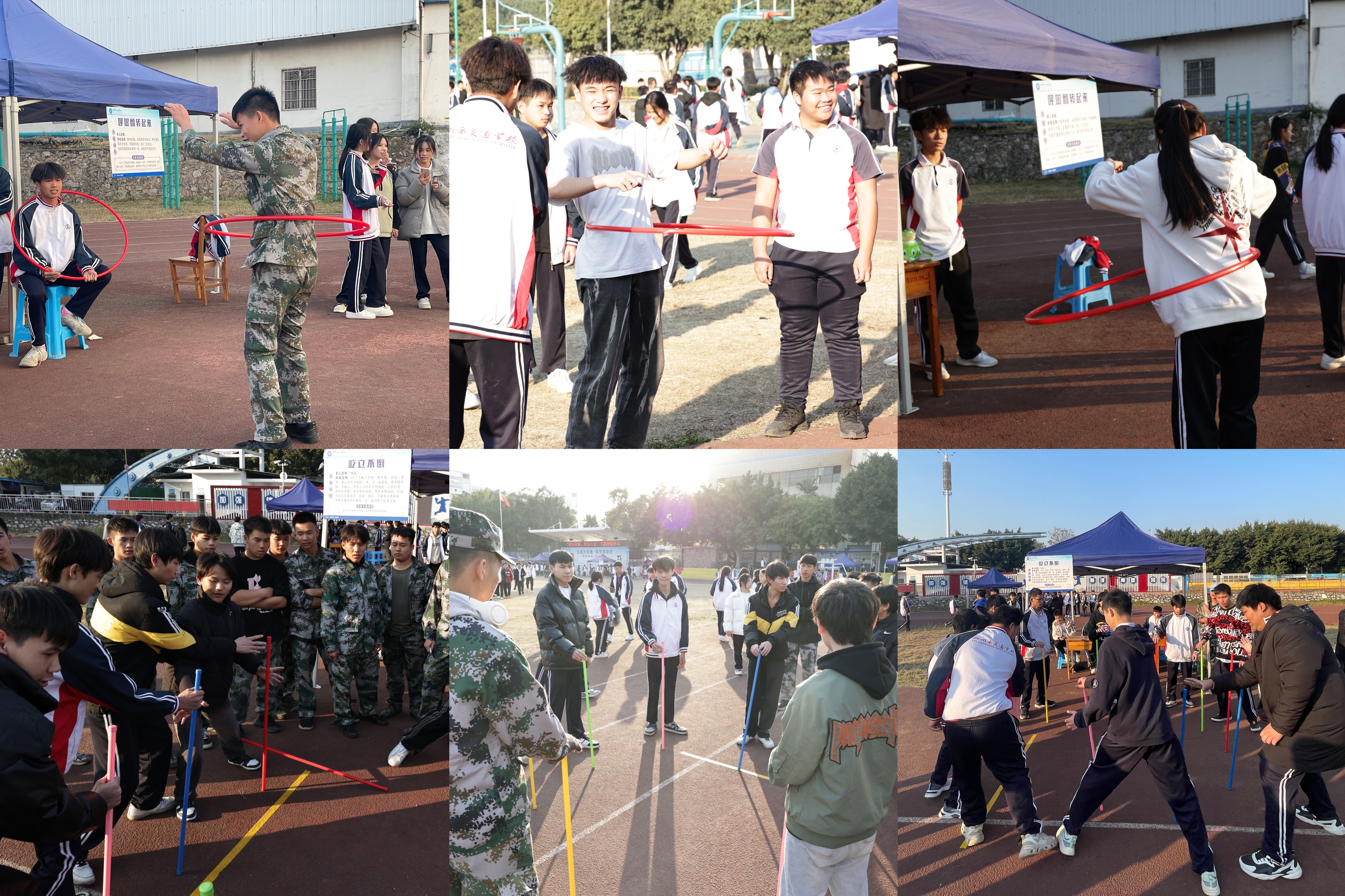此外,三人板鞋项目需要同学们默契配合,步调一致地穿越障碍;同心击鼓则需要大家齐心协力,共同掌控节奏;速度夹弹珠是一场速度与耐力的较量;呼啦圈转起来让现场充满欢声笑语;鱼跃龙门考验着同学们的跳跃能力;背夹球要求参赛者紧密配合,展现团队力量;屹立不倒和合力叠高则考验着同学们的平衡感和建筑智慧。