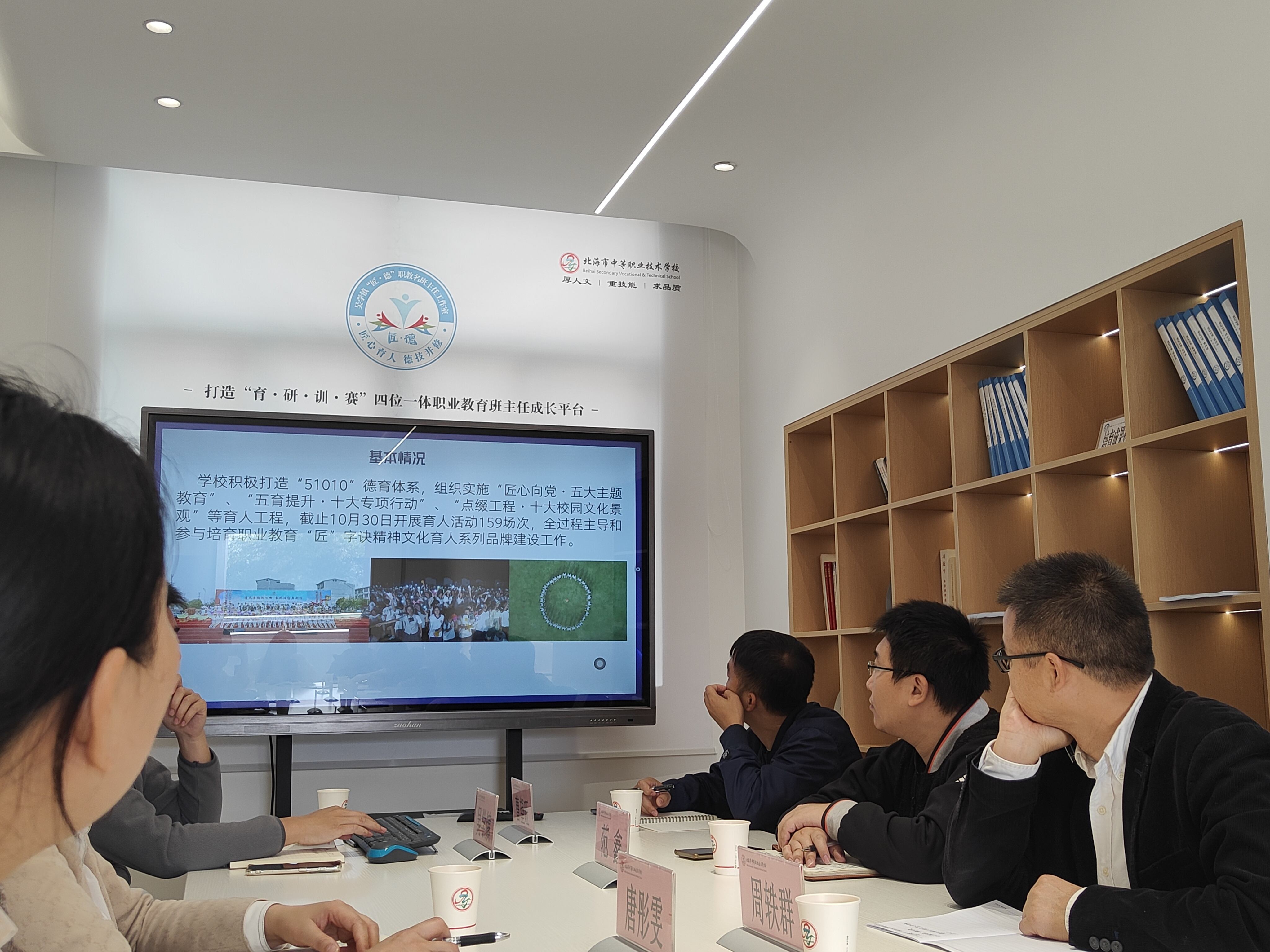 在参观完学生的宿舍后,唐彤雯副校长向我们就班主任队伍建设、学生管理工作等方面做了详细介绍,并由吴学镇书记介绍了“匠·德”名班主任工作室的建设成果、工作室的立项、核心理念、建设思路、研究分析方向等方面,大家全情投入倾听,收获颇丰。随后大家对名班主任工作室的建设情况展开交流。