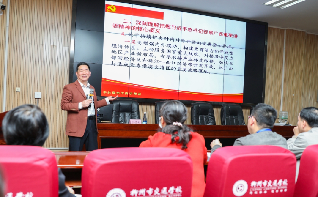 此次宣讲由市委讲师团团长陈谨礼主讲。陈团长以《学习贯彻习近平总书记对广西重大方略要求》为题,从充分认识学习贯彻习近平总书记视察广西重要讲话的重大意义、深刻理解把握习近平总书记视察广西重要讲话精神的核心要义、认真贯彻落实习近平总书记对广西重大方略要求和奋力推进中国式现代化柳州实践四个方面,系统阐释了习近平总书记对广西重大方略要求的精神实质、丰富内涵、实践要求,引导全校教职工深入贯彻落实习近平总书记对广西重大方略要求,深刻领悟“两个确立”的决定性意义,切实增强“四个意识”、坚定“四个自信”、做到“两个维护”,更好贯彻落实新发展理念,更好把握团结奋斗时代要求,坚定不移沿着习近平总书记指引的正确航向前进,在工作岗位上积极担当作为。