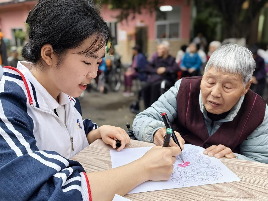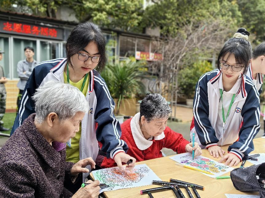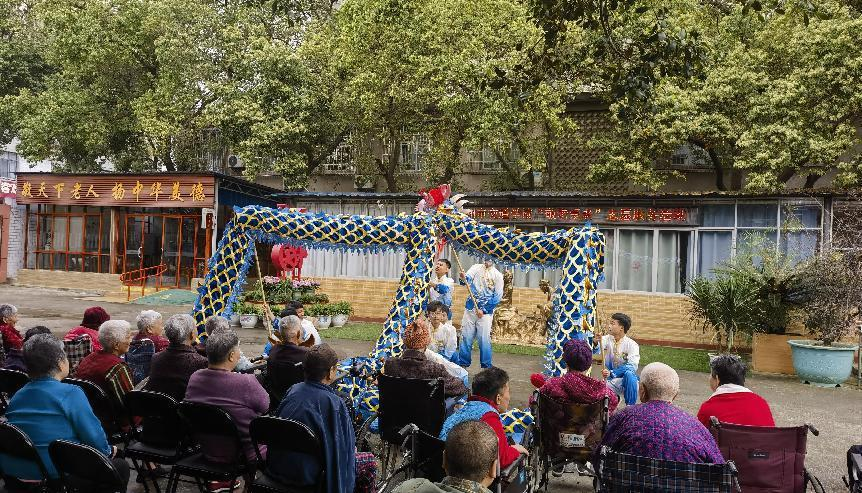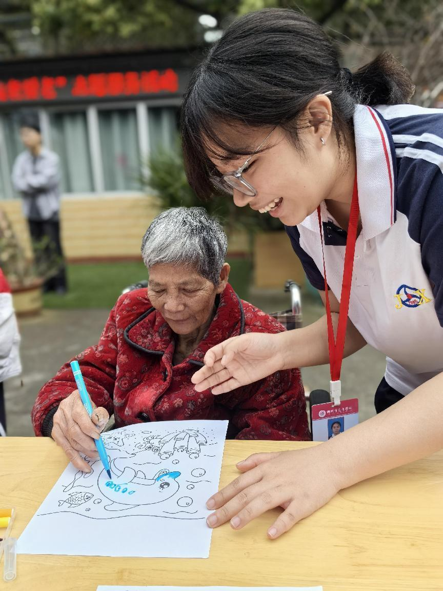 活动中,我校海翔舞龙队为老人们献上精彩的舞龙表演。龙腾祥云润气绕,龙飞千仞志气昂,愿老人们在龙年能够身体康健,幸福平安。除了表演节目外,青年志愿者们还陪伴老人们聊天、绘画。
