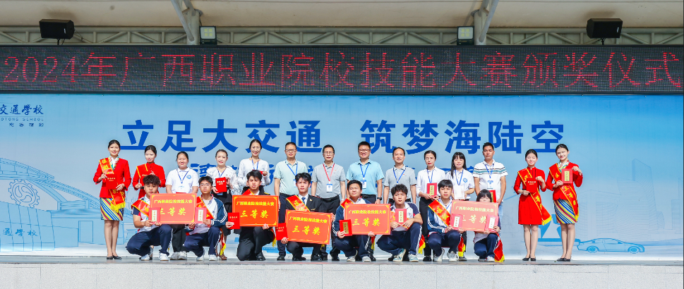 仪式上,潘雪玲主任宣读了我校2024年广西职业院校技能大赛和第三届全国交通运输中等职业学校水运类专业技能比赛获奖名单和表彰决定。在本届自治区技能大赛中,我校成绩取得了历史性突破,共获奖17项。其中,一等奖4项、二等奖5项和三等奖8项。在第三届全国交通运输中职学校水运类专业技能比赛中,我校共获得团体一等奖1项,优秀组织奖1项,单项一等奖7项、二等奖10项、三等奖1项。这也是我校首次承办国家级赛项比赛,充分彰显了学校的教学质量和办学实力。
