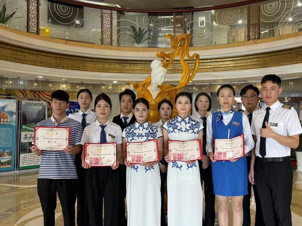 葛韦静同学凭借精湛的调酒技艺和出色的服务沟通能力,在大美游轮2024年岗位技能PK赛的酒吧组比赛中荣获一等奖。她不仅熟练掌握各种酒品的调制技巧,还能根据客人的需求和喜好,量身定制专属饮品,展现了极高的专业素养和服务水平。梁慧萍同学荣获餐厅摆台一等奖。在本次游轮公司实习之旅中,她便以勤奋好学、敬业爱岗的精神赢得同事们的广泛赞誉。比赛里她更是凭借精准的菜品摆放、优雅的餐具搭配以及恰好处的服务礼仪,成功征服了评委和观众的心。韦常美同学展现出色的客房铺床技能,荣获三等奖。她的细致入微和精湛技艺,赢得了评委们的一致好评。莫家欣同学则在餐厅摆台项目中获得了三等奖,她的努力和才华同样值得称赞。
